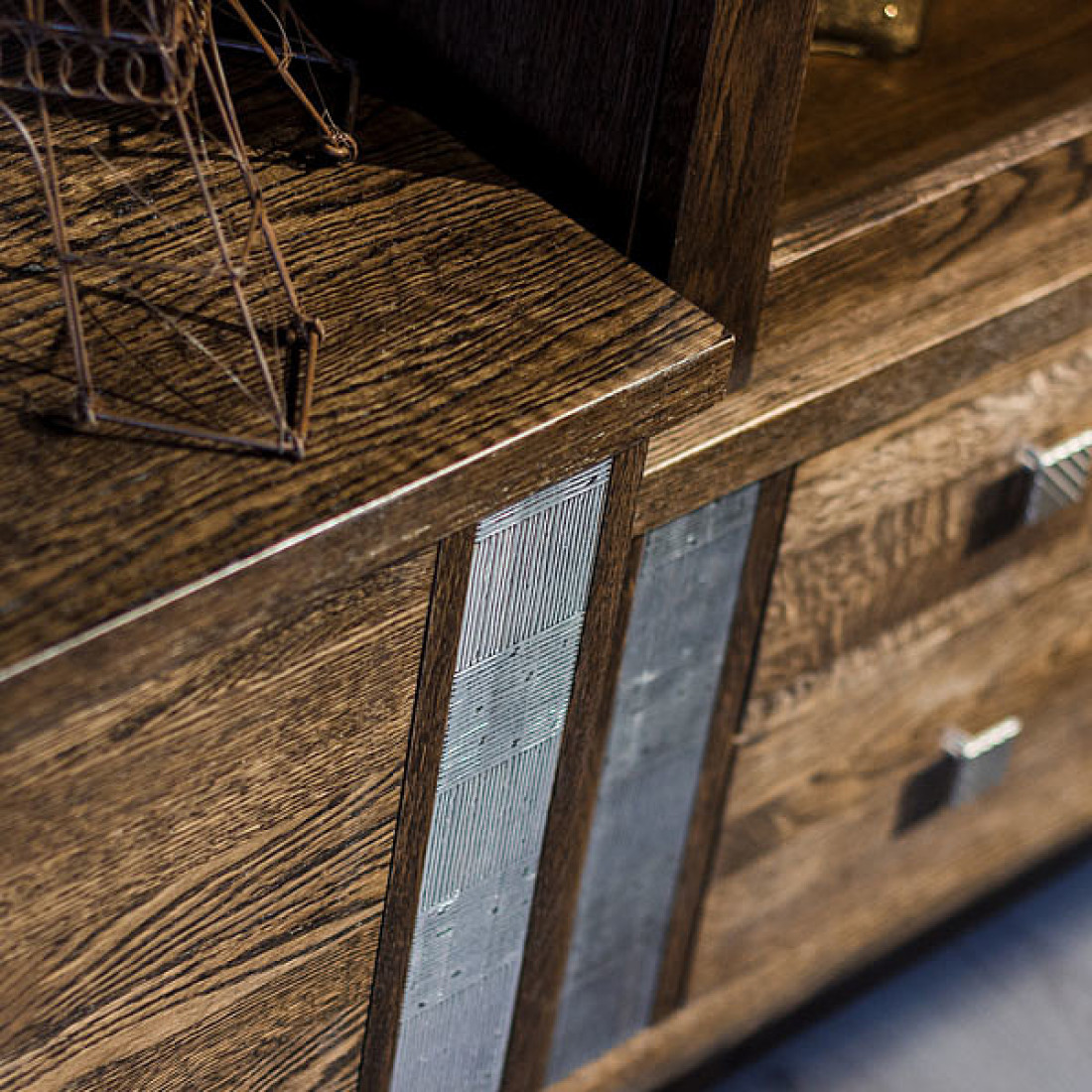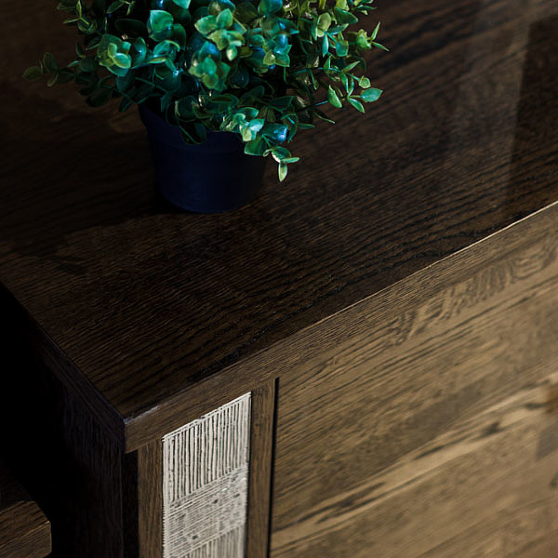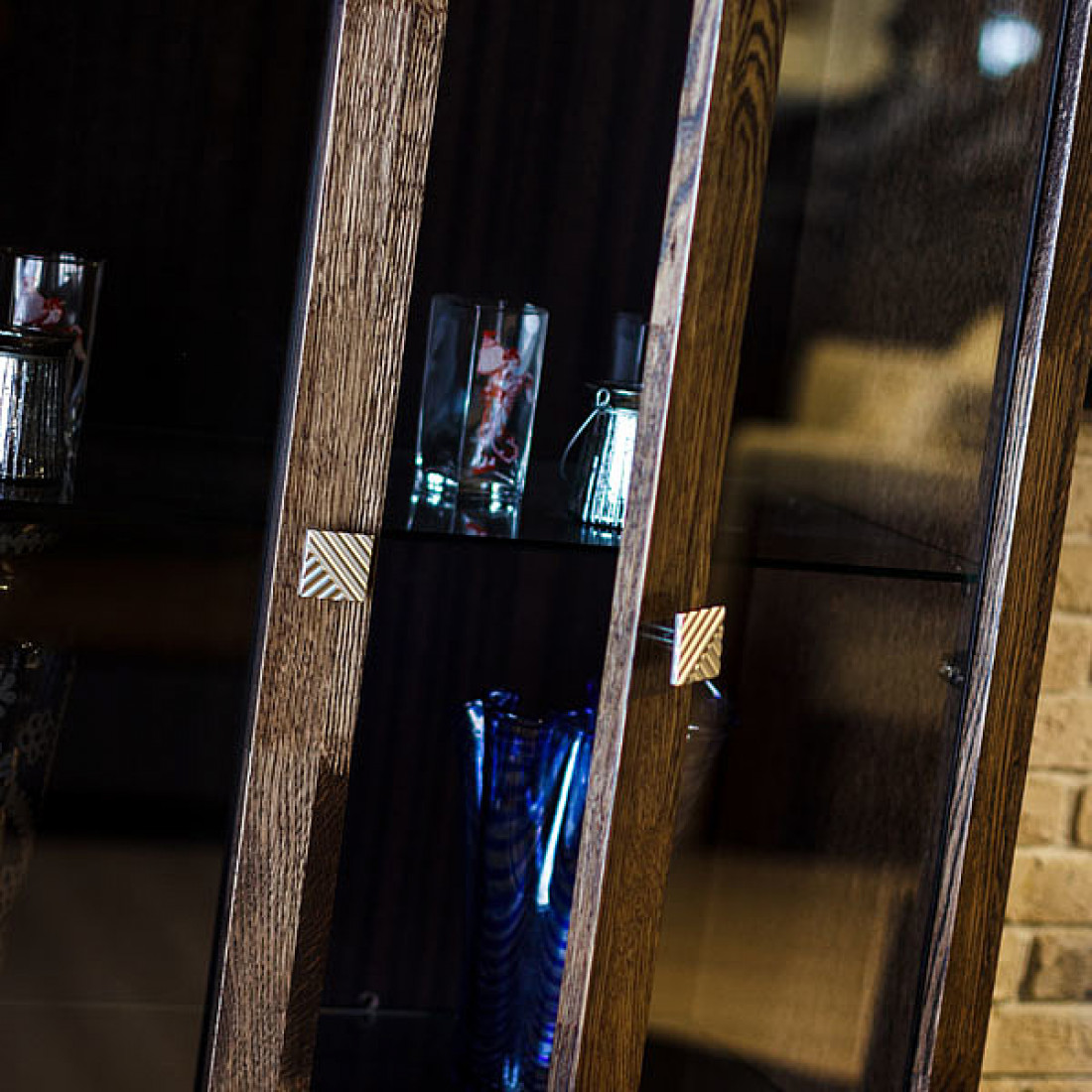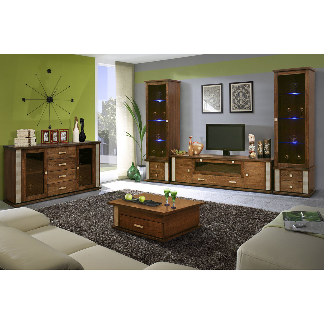 Очень эффектно подчеркнута текстура дуба крашением «венге», грамотно подобрана фурнитура в стилистическом единстве с декоративными вставками на фасадах. У всех, кто видел набор лично, создается впечатление, что дерево будто обожженное. А серебристые вставки из массива делают набор корпусной мебели «Тунис» очень запоминающимся и абсолютно непохожим на все другие программы. Стеклянные полки гостиной оснащены светодиодной подсветкой. Именно использование внутренней подсветки модулей подчеркнёт  красоту предметов интерьера, а также обеспечит мягкое освещение окружающего пространства.