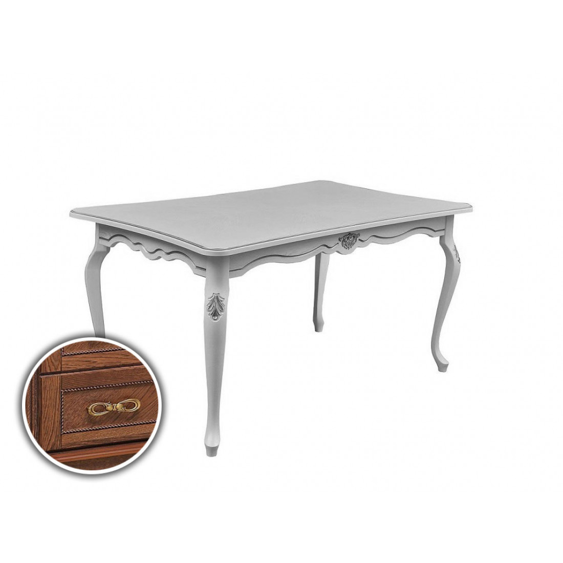 Столы с крышкой, имеющей декоративное профильное фрезерование кромок, из плиты древесноволокнистой средней плотности (плита МДФ), облицованной шпоном древесины по технологии "интарсия (инкрустация)", установленной на четыре точеные ножки из пиломатериалов лиственных или хвойных пород. Продольные и поперечные царги с фигурной нижней стороной и имеющими декоративное профильное фрезерование кромок и лицевой пласти, из пиломатериалов лиственных или хвойных пород. Продольные царги имеют декоративные накладные элементы.