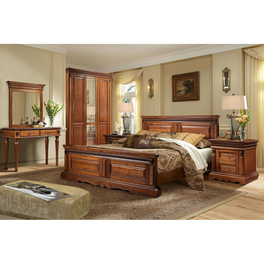 Данную коллекцию производят из ценной породы древесины - массива дуба, с которым по надежности не может сравниться ни один другой материал. Покрытие высококачественными лаками и полиуретановыми грунтами защитит эту великолепную мебель от незначительных повреждений в процессе пользования ею, а качественная немецкая фурнитура делает мебель очень удобной и надежной. Направляющие обеспечивают легкое, бесшумное скольжение ящиков.